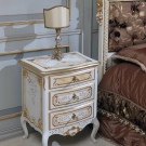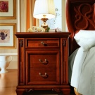 Друг интересен вариант е да поставите нощни шкафчета до леглото. Те не само изглеждат добре, но са и функционално допълнение към зоната за спане. Най -добре е да вземете две еднакви нощни шкафчета и да ги поставите около краищата на леглото. Не забравяйте, че симетрията е много важна в този стил. Но в същото време, ако стаята е проектирана за една, тогава трябва да има само една нощна шкафче. Освен това по този начин винаги ще имате всичко необходимо под ръка, а стаята ще придобие хармоничен и завършен вид. В нощните шкафчета могат да се поставят нощна лампа, книги, свещи или козметика, които използвате всяка вечер.