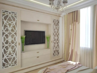 Ако допълните нишата с екран, който може да се премести, ако е необходимо, и скриете телевизора, в тази част на стената се оформя импровизиран гардероб..