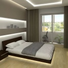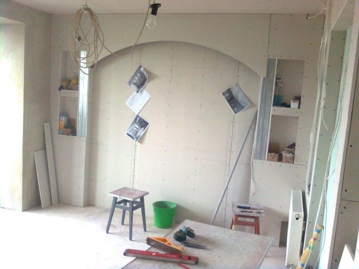 Гипсокартонът ви позволява да монтирате конструкции с различни форми. Сводеста вдлъбнатина с осветление изглежда много необичайна, както и ъглови ниши в спалнята..