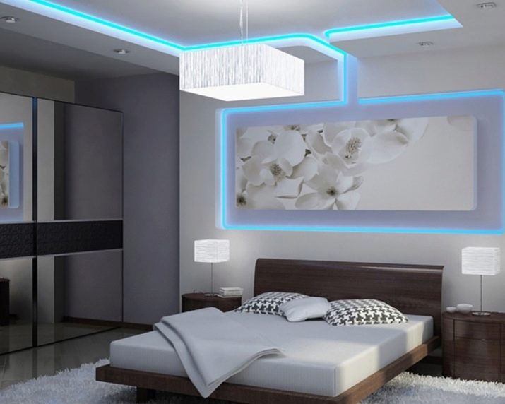 Структурата от гипсокартон не трябва да пречи на спалнята. С помощта на такава техника като осветление, нишата се трансформира в грандиозна архитектурна композиция. Уникалното осветление, което в допълнение към декора, носи функционално натоварване, трябва да бъде обмислено отделно. Източник на светлина над таблата ще даде възможност за четене. Разбира се, декоративният компонент на подсветката също е много важен. За това се използва LED лента, с помощта на която архитектурата на нишата ще придобие цвят..