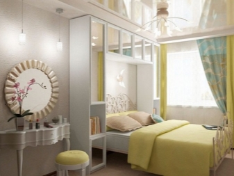 Леглото не е необходимо да се поставя по дълги стени. Така че ще има усещане, че дори леглото е било избутано в тази стая с мъка. Напротив – ако го поставите отсреща в стаята, ще има повече „въздух“. В този случай гардеробът трябва да бъде направен в ниша, за предпочитане с плъзгащи се плъзгащи се врати. Идеално, ако ще бъде монтиран на къса стена, в най -тъмната част на стаята.