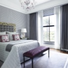 За да украсите такава стая, не се нуждаете от сложни компоненти. Голямото красиво легло в тази стая е основният акцент. Украсена е с раирано каре, което свързва основата на стаята и завесите. Над леглото има допълнително осветление, което не само поставя правилните акценти, но и прави стаята по -стилна и уютна.