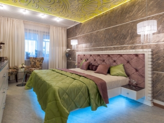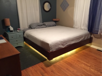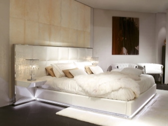 За да направите леглото “ефирно” и да намалите масивността му, можете да оборудвате дъното с диодно осветление. Мястото за спане трябва да е на най -удобното място. Не забравяйте да оставите място за странични маси, около 40-60 сантиметра.