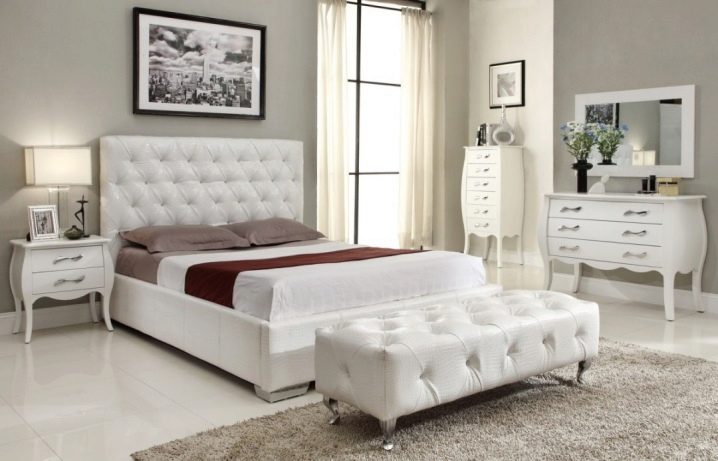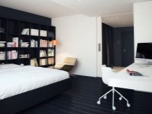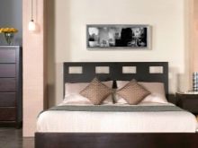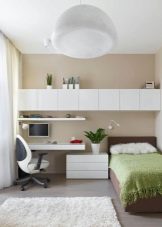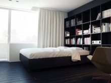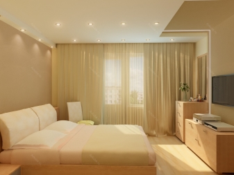 Ако стаята е дълга, поставете гардероб пред леглото.. Ако е квадратна, тогава тя трябва да бъде поставена отстрани. Нощно шкафче с телевизор също е поставено срещу леглото, а пейка до краката. По -добре е да използвате бели мебели – или такива, които да се сливат с пода на сянка. Моля, обърнете внимание, че мебелите в светли нюанси визуално ще направят таваните по -високи, а тъмните – по -ниски..