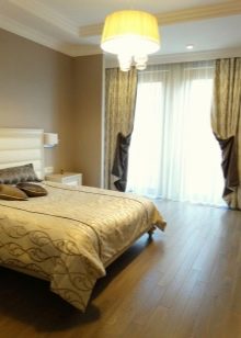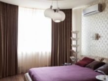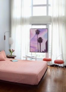 За да увеличите визуално пространството, можете да направите панорамен прозорец в цял ръст или да поставите гардероб с врати с лъскава метална повърхност. Завесите в този стил не се използват, заменете ги с щори или прости завеси с вертикални плисета.