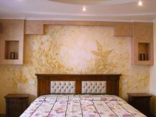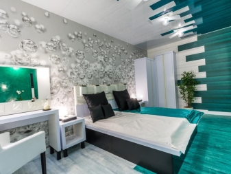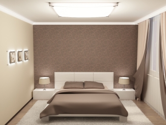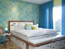 Обърнете внимание, че определена комбинация от тапети може да помогне за подобряване на пропорциите на малка площ.. Например, за тясна стая, залепете обикновен тапет върху едната стена, а от другата – в лента, кръг (можете да изберете други геометрични елементи). Този трик ще ви позволи да зонирате пространството, а спалнята няма да прилича на тунел..