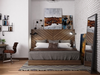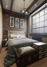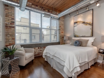 - Таванско помещение – елементи от този стил могат да се използват и в интериора на малка спалня. За облицовка на стени можете да използвате имитация на тухлена зидария. Поставете легло без крака. Няма нужда да украсявате пода с килими. На практика не трябва да има декоративни детайли в дизайна на тази стая. Можете да използвате огледало в тънка рамка, строги лампи, няколко черно -бели акцента. Хората в тази стая трябва да останат с впечатлението, че сте тук временно и няма да задържате..