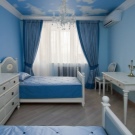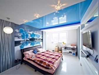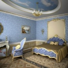 Сините нюанси имат невероятни оптични свойства. Дори малка стая, направена в небесни цветове, изглежда визуално много по -голяма и по -свободна. Няма нужда да добавяте силен контраст към такава стая. Ето защо таванът и стените са най -добре декорирани в една и съща цветова палитра.. Най -добрият вариант би бил да направите тавана на спалнята с няколко тона, различен от цвета на сините стени..