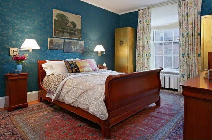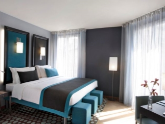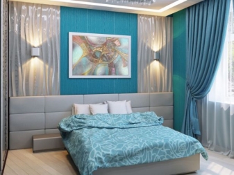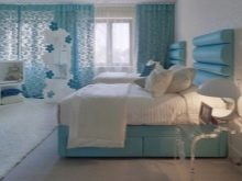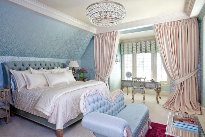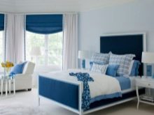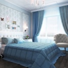 Много е важно да изберете правилните завеси за тапети в сини тонове.. Най -добре е да ги изберете в една и съща цветова схема, като в този случай те ще бъдат комбинирани с всички елементи на декора и мебели, както и хармонично ще се впишат в цялостния интериор на спалнята..