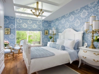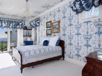 Светлите шарки изглеждат много великолепни на фона на небесни нюанси. Наличието на гжел, монограми, къдрици, флорални шарки ще придаде изящен акцент на стенното покритие.