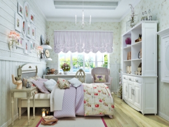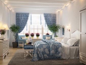 Ако спалнята ви е декорирана в стил Прованс, определено трябва да закупите завеси с орнаменти под формата на малки нежни цветя или в тънка клетка. Ще бъде много добре, ако сянката на шаблона на завесата се повтаря в дизайна на покривало за диван, фотьойл, легло или в който и да е друг текстилен елемент..