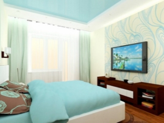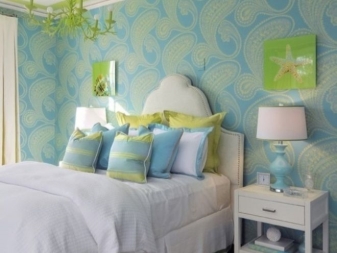 Комбинацията от сини и зелени тонове за тапети в спалнята ще бъде много хармонична. Тези цветове могат да се считат за подобни, така че всеки от тях може да доминира в интериора. Стаята ще изглежда много естествено и хармонично. Живите растения и декоративните палми ще бъдат чудесно допълнение към интериора в зелени и сини тонове..