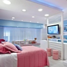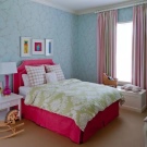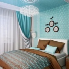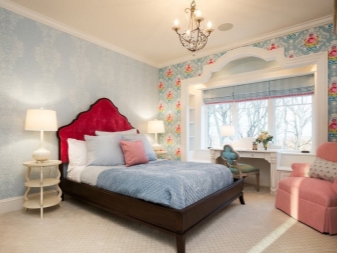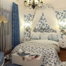 Сините тапети с розови акценти ще изглеждат красиви. В такъв интериор розово покривало на леглото, както и деликатни шарки на гардероба, ще бъдат подходящи..