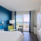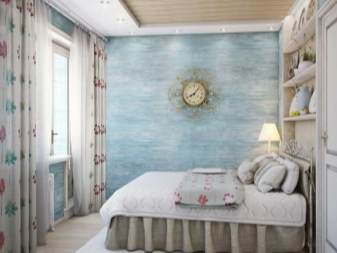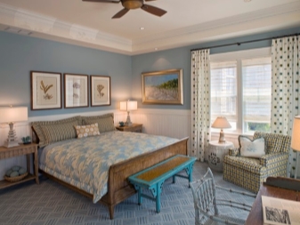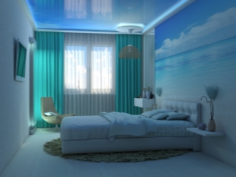 Би било подходящо да поставите фототапет с изображение на лазурното море на стената над леглото. По -добре е да изберете мебели в синьо в по -класически стил.. В нюанси на синьо можете също да изберете пердета и покривки.