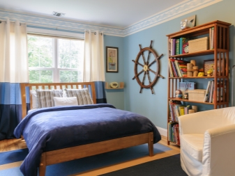 Опитайте да експериментирате и да направите, например, раирани стени в стаята. Също така е важно да изберете стилен тематичен декор – изберете щампи с морски звезди и обитатели на океана, картини, изобразяващи кораби и езера и други интересни елементи на декора.