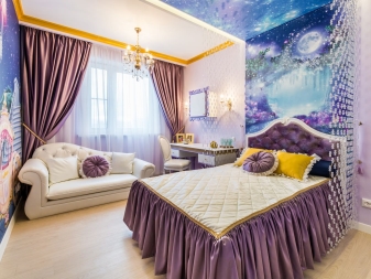 Лилаво покривало, съчетано с лавандулови копринени завеси на фона на светлосин тапет, ще внесе свежи, богати нотки в дизайна на спалнята.