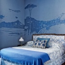 Най -често стените и таванът са най -ярките в синята стая.. Синият или аквамаринов тапет ви позволява визуално да разширите пространството, което много хора използват. Ако не харесвате обикновени стени, можете да допълните стаята с картини, които съответстват на стила или фототапета. Например, ако искате да украсите стая в морски стил, тогава изображенията на топъл морски бряг и палми определено няма да бъдат излишни в него..