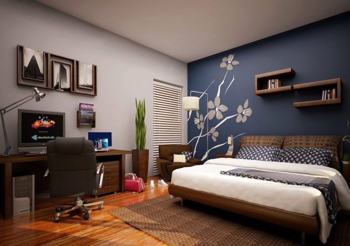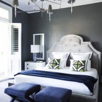 Когато подреждате стая, си струва да запомните, че цветовата палитра на бъдещата спалня задължително трябва да съдържа спокойни, меки и нежни тонове. Психолозите казват, че именно сиво-синята комбинация отговаря напълно на представените изисквания. Тъмносиният цвят е изключително приятен за окото и не дразни нервната система, а в комбинация със сиви нюанси може да придаде на интериора ненатрапчив и по -удобен вид.