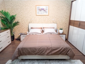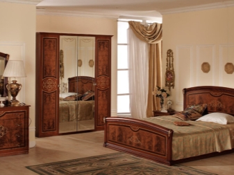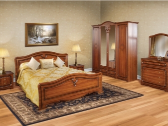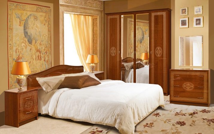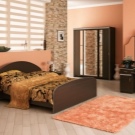 Ореховият нюанс на спалнята изглежда особено солиден. Дори визуално можете да почувствате надеждността на конструкциите и комфорта, който това великолепно обзавеждане дава.