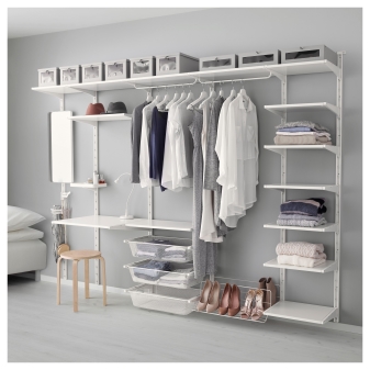 - Комбинацията от гардероб е истинска находка. Тази система комбинира стандартна закачалка, стелажи за съхранение, кутии за обувки и място за съхранение на дребни предмети. Закупувайки една такава комбинация, няма нужда да купувате допълнително място за съхранение. Такива гардеробни системи са представени в много широк диапазон. Всеки модел се различава от другия по своя капацитет, външен вид и броя и вида отделения за дрехи и обувки.