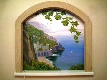 По-труден вариант е да инсталирате пълноценен прозорец. Единственото, което ще го отличава от обичайното, е изкуствеността на пейзажа.. За монтаж ще ви е необходима масивна дървена рамка с врати и стъкло. Можете да прикачите същите снимки към него. Такъв прозорец може безопасно да бъде завесен със завеси или тюл, съобразявайки ги със стиловите характеристики на вашата стая..