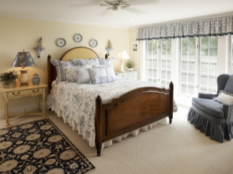 Килимът трябва да е естествен, с къса купчина. Можете да поставите един килим в центъра на стаята или няколко покривала до леглото. Дизайнът на спалня в английски стил изисква много инвестиции..