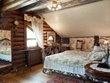 В дървена къща можете да създавате стилен интериор, напомнящ за стая в селска хижа. За това се използват прости мебели без излишни украшения. Интересен вариант е легло и спален комплект, стилизирани като дърво. Грубостите, неравностите и други видими “недостатъци” са добре дошли тук. Мебелите изглеждат интересни, направени сякаш от накъсани клони. В такъв интериор биха били подходящи обикновени завеси от сурово бельо или тънка лека коприна. Можете също така да украсите мебелите си с ръчно изработени салфетки или одеяла. Ако не знаете как да плетете или бродирате, тогава можете да опитате да шиете пачуърк юрган. Изглежда достатъчно ярък, така че ще украси всяка стая..