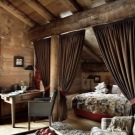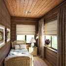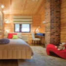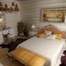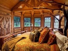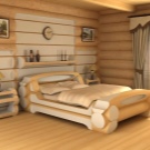 В дървена къща можете да създавате стилен интериор, напомнящ за стая в селска хижа. За това се използват прости мебели без излишни украшения. Интересен вариант е легло и спален комплект, стилизирани като дърво. Грубостите, неравностите и други видими “недостатъци” са добре дошли тук. Мебелите изглеждат интересни, направени сякаш от накъсани клони. В такъв интериор биха били подходящи обикновени завеси от сурово бельо или тънка лека коприна. Можете също така да украсите мебелите си с ръчно изработени салфетки или одеяла. Ако не знаете как да плетете или бродирате, тогава можете да опитате да шиете пачуърк юрган. Изглежда достатъчно ярък, така че ще украси всяка стая..