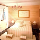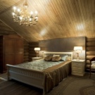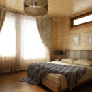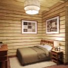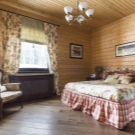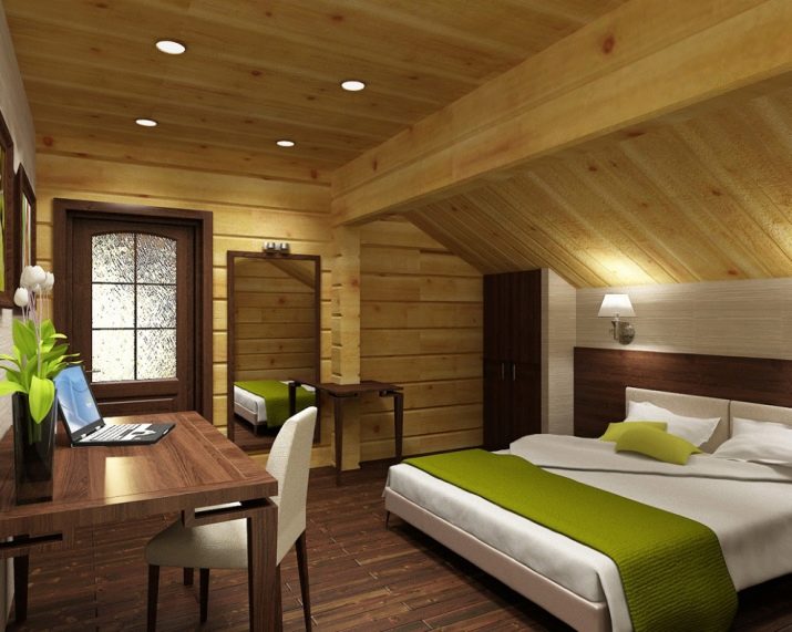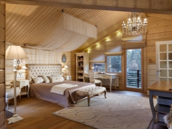 В дървена къща трябва да се обърне специално внимание на осветлението.. Наложително е да инсталирате изкуствени източници на светлина в спалнята. На първо място, трябва да се погрижите за горното осветление. Като алтернатива можете да инсталирате различни подови лампи, аплици или прости настолни лампи..