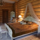 В дървена къща можете да създадете интересна версия на уютна спалня за младоженци или зряла двойка. В центъра на всяка спалня е широко, удобно легло. Желателно е той да съответства на цвета на интериора. Ако самата стая е от тъмно дърво, тогава леглото също трябва да е такова. Можете да го украсите по различни начини. Най -лесният начин е да го покриете с одеяло и да поставите декоративни възглавници. Можете също да опитате да инсталирате сенник. Тя може да бъде пълна, покриваща цялото легло, или едва видима и полупрозрачна. Във всеки случай, такъв декоративен детайл ще придаде само специална жар на стаята..