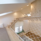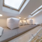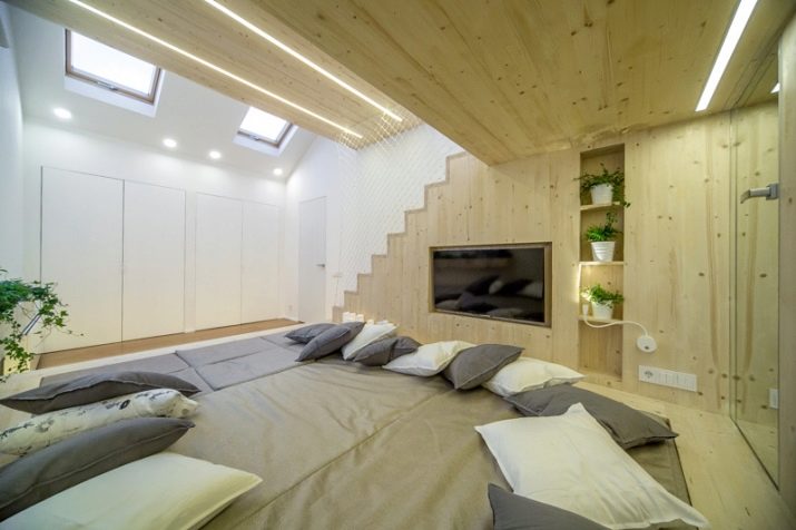 В такава стая не е нужно да мислите как да разделите стаята на няколко зони – всичко вече е направено за вас. Така че, на приземния етаж можете да инсталирате диван и няколко уютни кресла с маса. По -горе можете да поставите работна зона, а след това зона за спане. Мястото за сядане трябва да бъде най -внимателно.