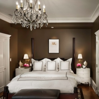 Когато избирате декорацията за кафява спалня, решете предварително какво ще бъде кафяво: стени или мебелни фасади. Тук основното правило е светлите мебели да се поставят на фона на тъмните стени и напротив, ако мебелите са светли цветове, тогава фонът е тъмен.