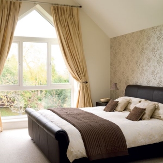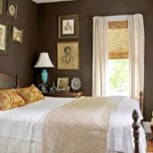 Отворът на прозореца трябва да бъде максимално отворен, ако спалнята е кафява. Няма нужда да покривате напълно прозореца с тъмни завеси.
