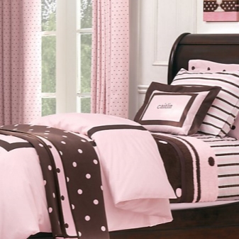 Кафяво-розовата спалня създава впечатление за празник, интериорът има особен шик и изтънченост. Подобен ефект е възможен с коралови, червени партньорски цветове.