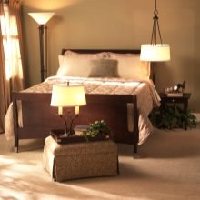 Интересни фотографии или картини с дървени рамки, оригинални лампи с ярък стъклен или текстилен абажур, които ще бъдат инсталирани на нощни шкафчета, декоративни елементи за коване, например, това могат да бъдат специални скоби за фиксиране на лампи, много красив полилей може да служи като декор..