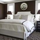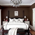 Не се препоръчва използването на черно като придружител. Може би това е единственият цвят, противопоказан за кафява спалня..