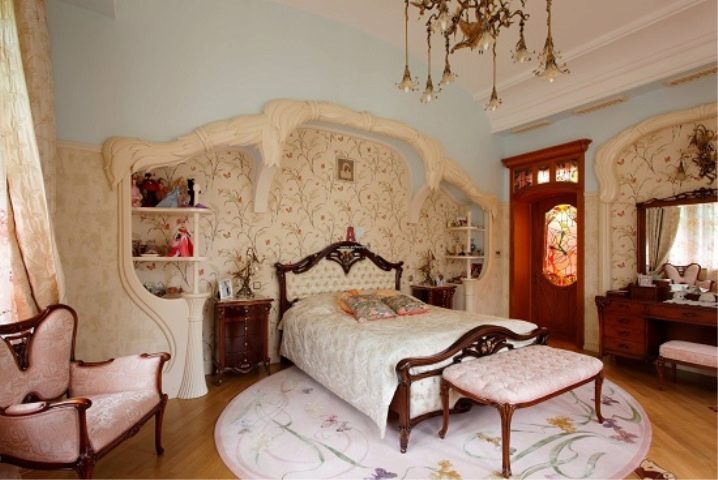 Спалнята в стил Арт Нуво, като правило, използва стандартен комплект, който се състои от легло, 1-2 нощни шкафчета, огледало, скрин или гардероб.