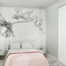 За да украсите стената над леглото, можете да използвате панел от естествено дърво. Такива повърхности се използват активно в този стил. Растителните мотиви ни доближават до природата и добавят модерен аромат.