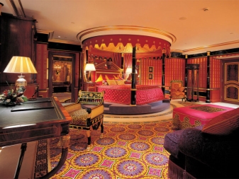Интериорът в ориенталски стил е свързан с луксозните дворци на арабските шейхове, където има много злато, бивни от слонова кост и скъпи тъкани. Интериорът на тези стаи е наистина невероятен..