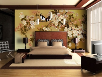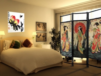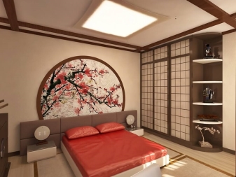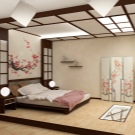 Картината използва изображения на японски дворци и пагоди, сакура, лотоси, самураи, слънце. Можете да разнообразите сдържания интериор с паравани с традиционни мотиви. Японските оръжия също ще изглеждат органично в такава стая..