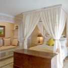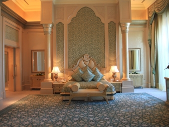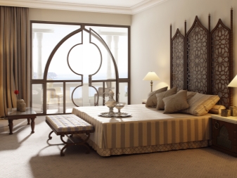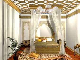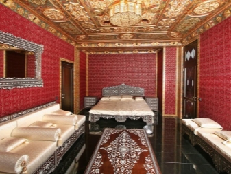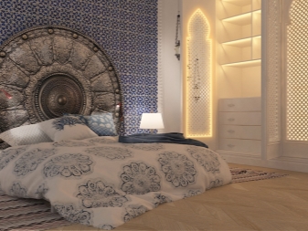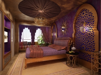 Освен това спалнята често служи като място за тих отдих и приемане на гости. Затова в арабските интериори често подреждат ъгъл отстрани с диван с красива тапицерия, ниска маса за пиене на чай и възглавници или марокански кожени тахти. Може да се постави в ниша и да се драпира.