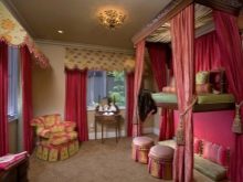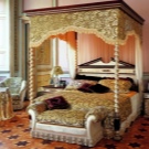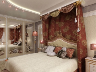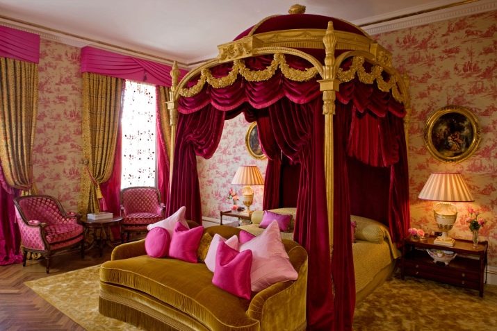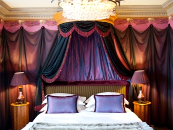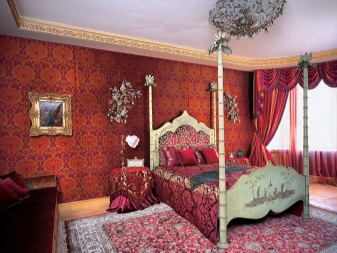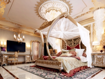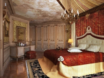 Тъй като леглото е в центъра на дизайна, то трябва да бъде декорирано в шик.. Вниманието трябва да бъде насочено към таблата. Тя може да бъде масивно, издълбано дърво с инкрустация. Сенникът над леглото трябва да наподобява палатка и да бъде направен от скъпи тежки материи като кадифе или коприна. В наистина богат интериор стълбовете за легло са украсени с дърворезби, вложки от скъпоценни камъни или дори бивни на слонове..