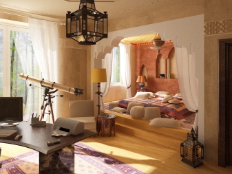 Лампи от ковано желязо, които излъчват светлина по специален начин, ще помогнат да потопите стаята в мистериозен здрач. Те не трябва да се носят от арабски страни; те се намират и в руските магазини. Ламбрикените могат да се поставят над прозорците, особено ако не е възможно да се изгради характерна ниша с ланцет.