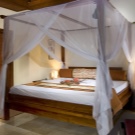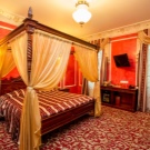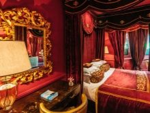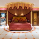 Най -изразителният детайл от интериора е луксозната дървена табла, покрита с дърворезба. Струва си да се обърне внимание колко страхотно изглеждат осмоъгълните маси като нощни шкафчета. Повтарящият се модел в текстила на стаята го прави да изглежда като кутия със съкровища.