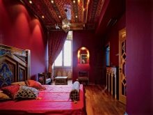 Малка спалня изглежда впечатляващо поради използването на богати цветове. Ориенталските аксесоари допълват визията. Вижте, улавя златна арабска писменост на стената. Това е наистина автентичен ориенталски интериор.
