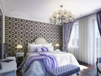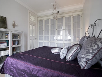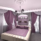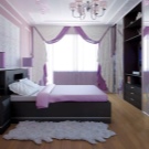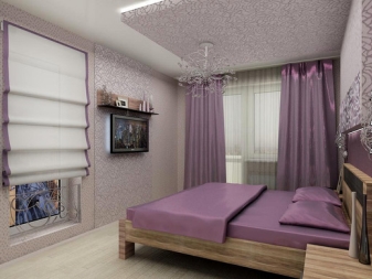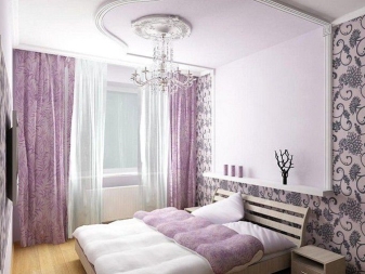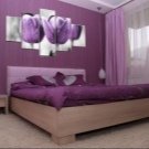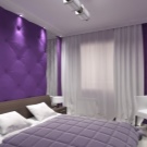 Когато използвате лилаво в завеси, трябва да обърнете внимание на осветлението на спалнята: дебелите завеси от патладжан ще предпазят стаята от ярка слънчева светлина. При слаба светлина се използват завеси и тюл от меки люлякови или меки лавандулови нюанси.