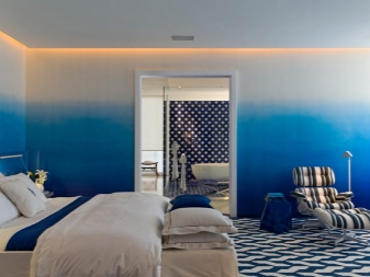 - Версията с градиент изглежда красива. В този случай цветът от по -наситен плавно се влива в по -светъл. В малка спалня този ефект изглежда наистина готин. Тук по -долу се намират тъмни нюанси, а светлите се издигат нагоре. Ако имате ниски тавани, ще изглежда много готино..