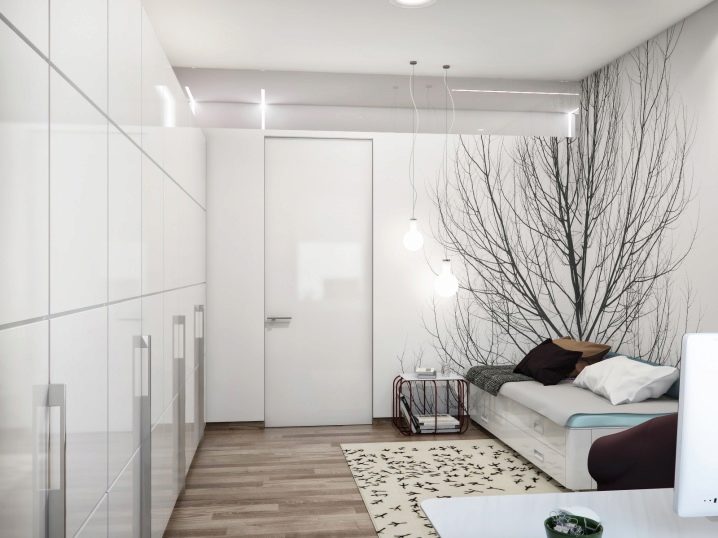 Дори най -простият вариант, използващ само бял цвят, ще изглежда интересен, ако добавите някои големи и оригинални детайли в стаята. Например, отпечатване на дърво. Поради контраста изглежда забележим и интересен..