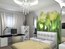 Връзката на фототапета може да съществува практически с любимия елемент на спалнята. Дори с саксия на прозореца, която може да бъде не по -малко ефектна от комбинация, например, с килим или килим. Между другото, изборът на същия модел на покривало на леглото и фототапета, разположен на таблата, ви позволява да постигнете интересен ефект. Случва се покривалото и тапетът да се слеят в една текстура, която преминава през стаята, започвайки от леглото и се придвижвайки към стената, понякога същият фототапет също се добавя към тавана, след което декоративната линия се разтяга още повече и създава ефектът от обгръщането на пространството.