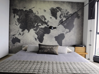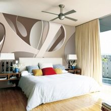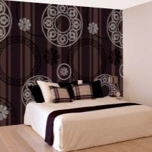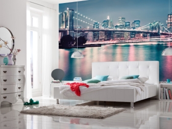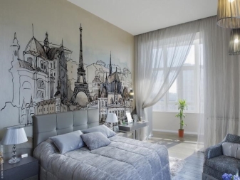 Комбинацията от фототапети и текстил за спалня се превръща в популярен феномен днес. Тук можете да дадете следните примери: покривало и тапет имат идентичен печат, такова решение винаги изглежда интересно и свежо. В допълнение, текстилът и тапетите могат да се припокриват в цветовия спектър, когато например обикновените завеси ще съответстват на цвета на модела върху платното за тапети..